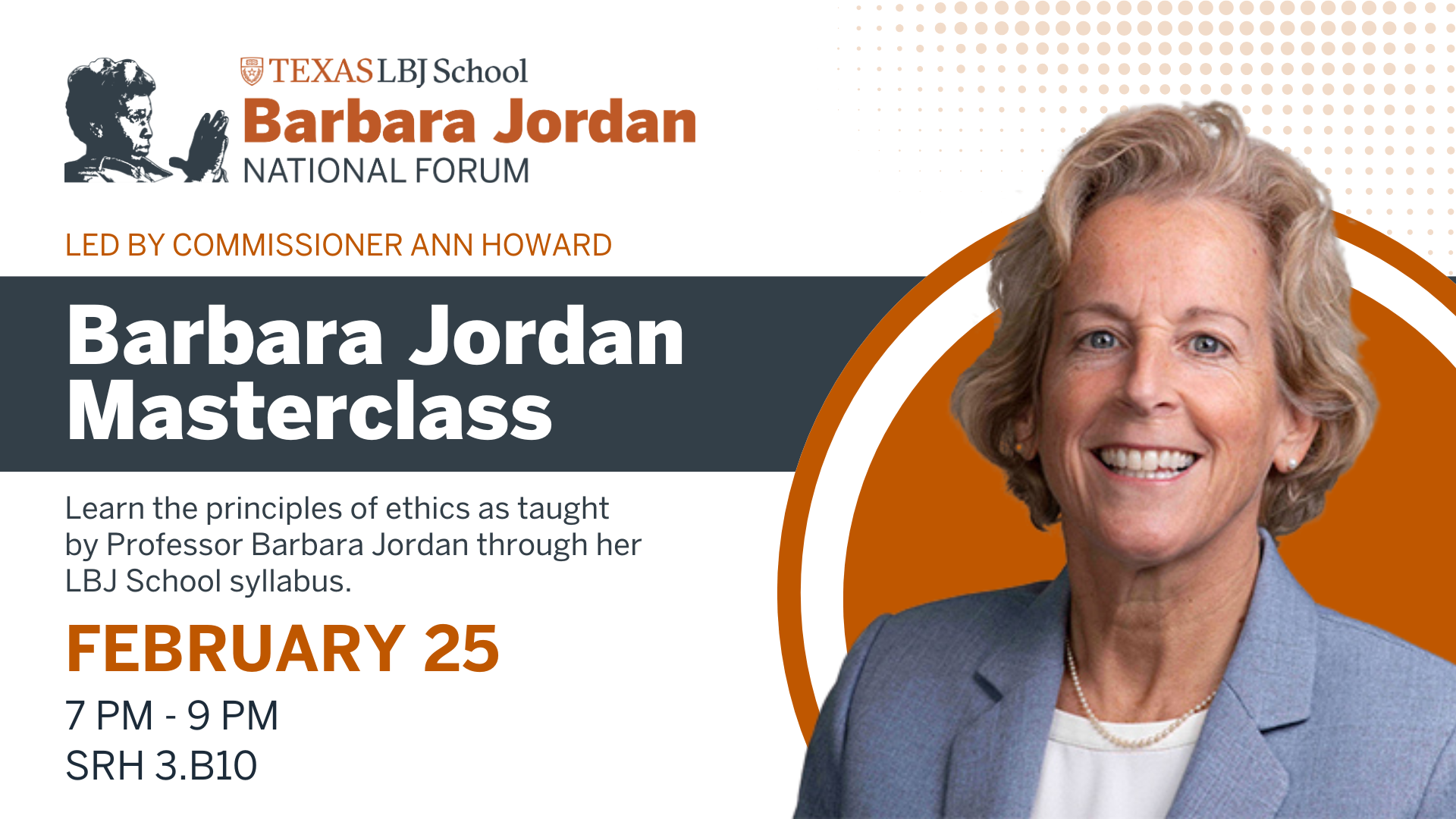 Have you ever wondered what it would be like to sit in a classroom guided by the inspiring Barbara Jordan? Well, here’s your chance! Join us for a unique educational experience where Commissioner Ann Howard (MPAff '1988) will lead a class using Barbara Jordan’s original syllabus, bringing the wisdom and passion of this legendary figure to life.