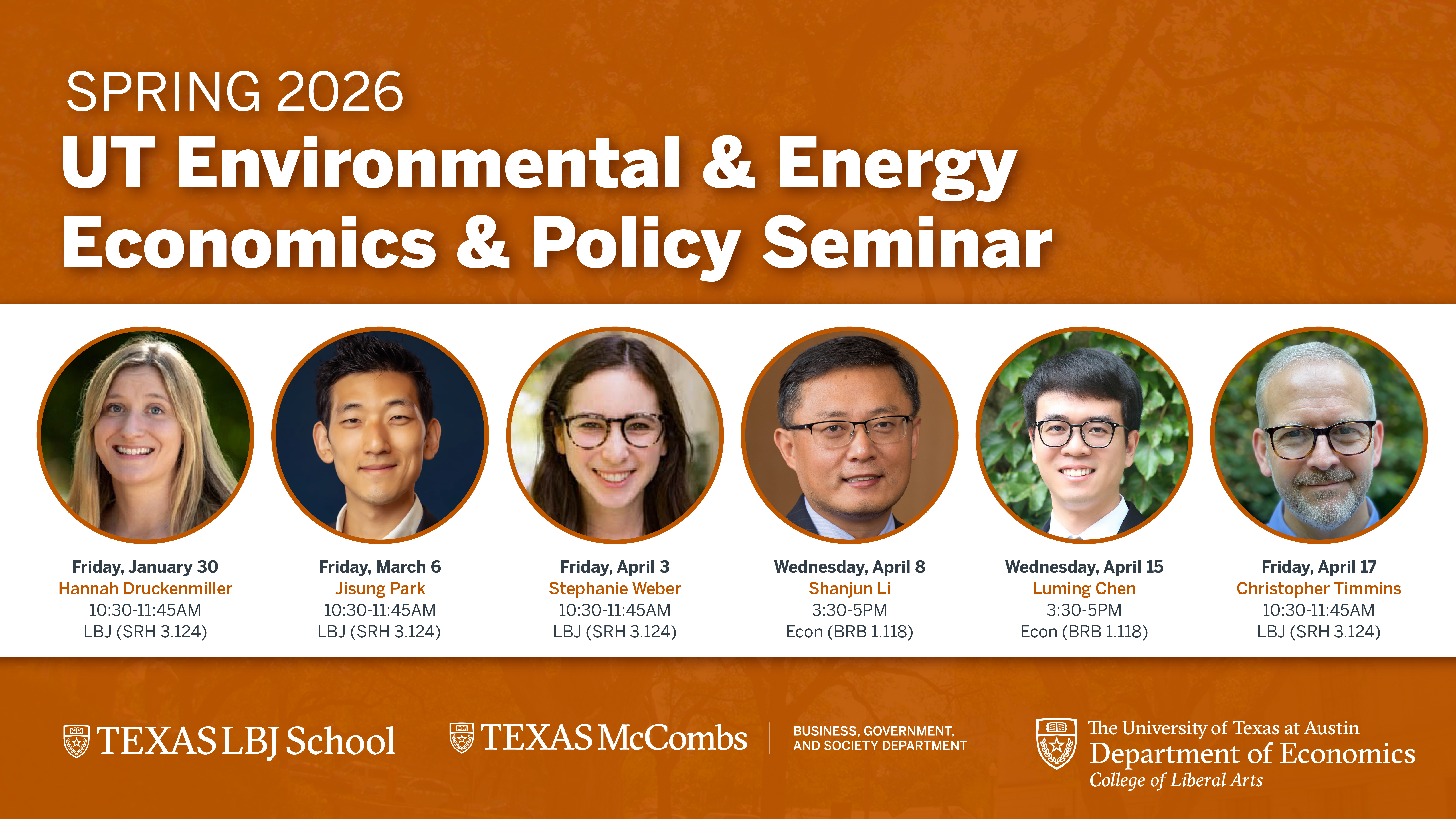 The LBJ School of Public Affairs, UT Economics, and the McCombs Department of Business, Government, and Society will continue our Environmental Economics research series for the Fall 2025 semester. Come hear from academics and subject matter experts in the field, including: