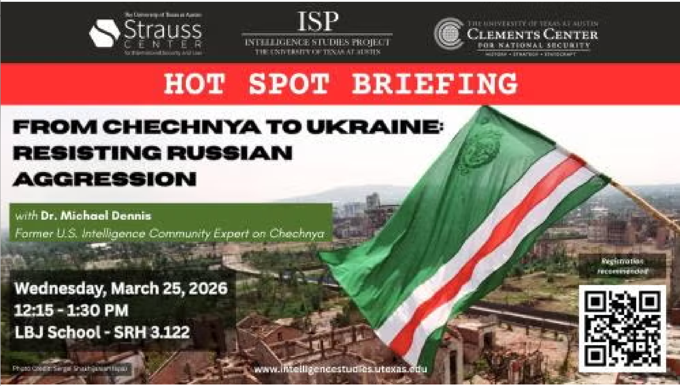 On Wednesday, March 25, 2026, from 12:15 PM to 1:30 PM in the LBJ School’s SRH 3.122, the Clements-Strauss Intelligence Studies Project will host a public event, “HOT SPOT BRIEFING – From Chechnya to Ukraine: Resisting Russian Aggression,” with Dr. Michael Dennis, former U.S. Intelligence Community Expert on Chechnya and Associate Professor of Practice at the LBJ School. The event is free and open to the public. Registration recommended at http://bit.ly/3ZSS4VR.