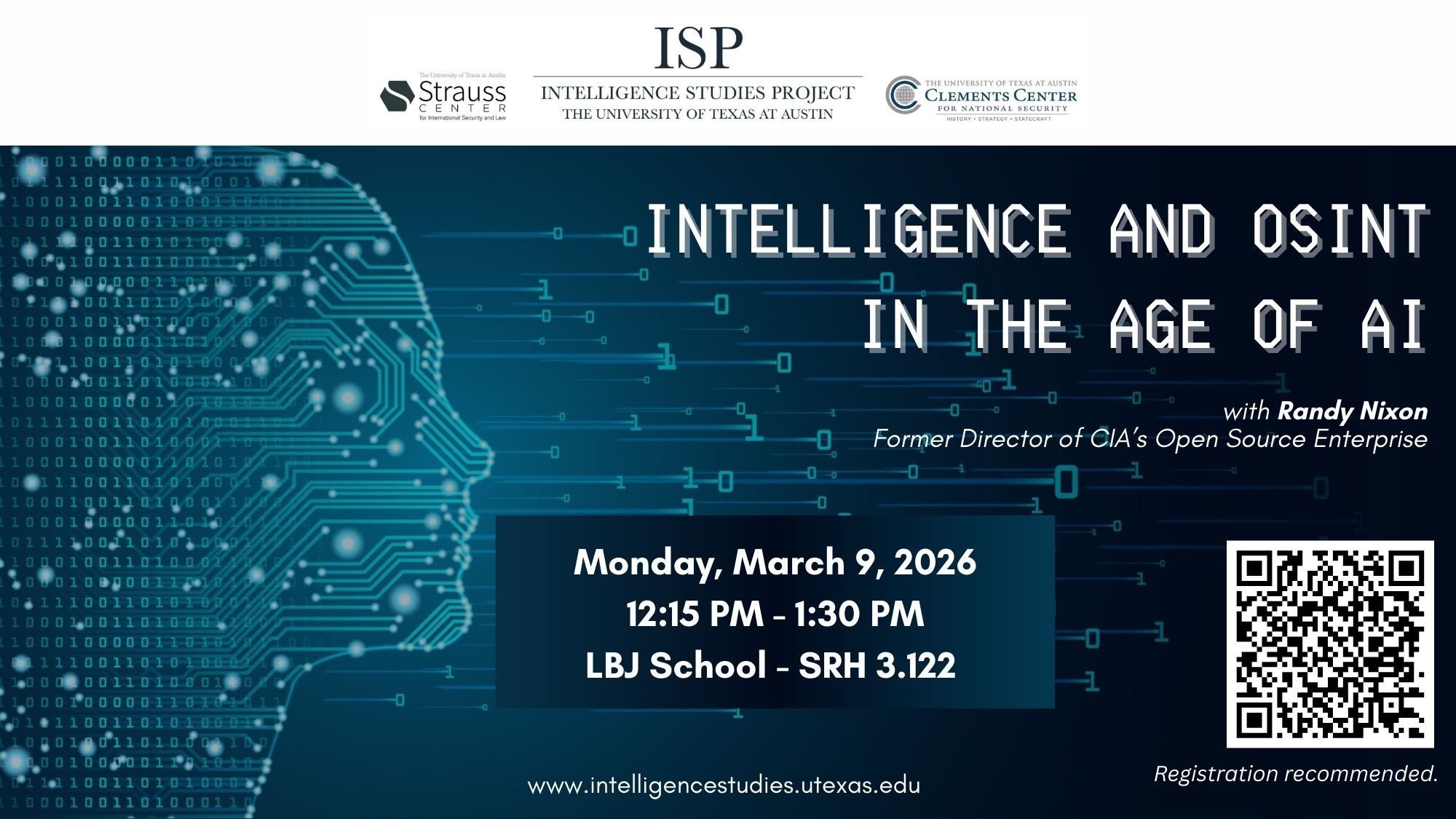 On Monday, March 9, 2026, the Clements-Strauss Intelligence Studies Project (ISP) will host a public event, “Intelligence and OSINT in the Age of AI,” with Randy Nixon, former Director of the CIA’s Open Source Enterprise. This event will mark the first of ISP’s Off the Wire series. The event is free and open to the public. Register at https://bit.ly/4bGFz6N.