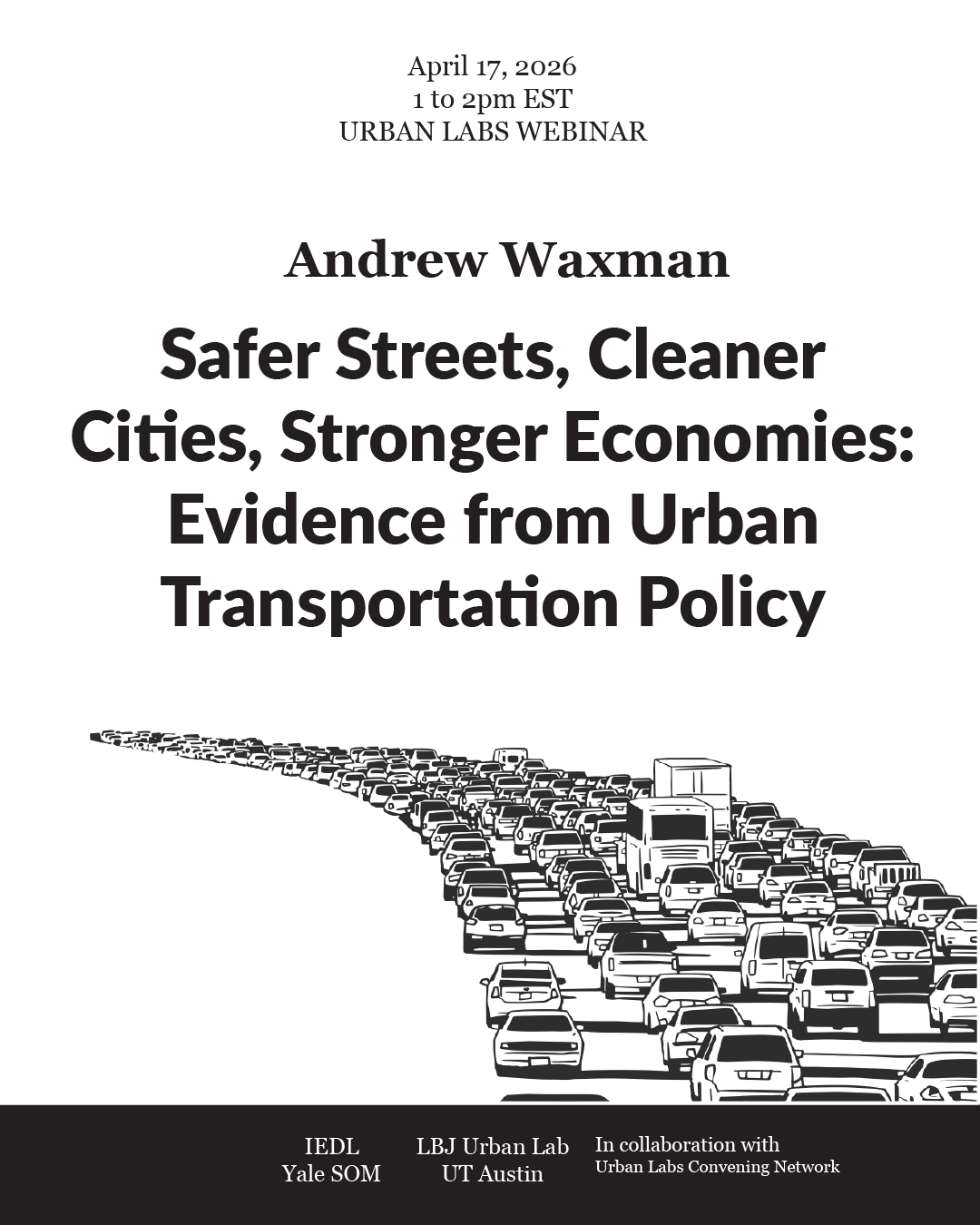 Cities face growing pressure to improve safety, reduce emissions, and expand economic opportunity while managing congestion and limited infrastructure capacity. Can transportation policy advance these goals at the same time? In this webinar, Andrew Waxman, Associate Professor at the LBJ School of Public Affairs at the University of Texas at Austin, examines how transportation policy shapes commuting behavior, residential location decisions, environmental outcomes, and access to jobs. Drawing on research on congestion pricing, real-time roadway pricing, commuting patterns, and vehicle emissions, the session explores how transportation policy affects both travel behavior and the broader organization of cities.
